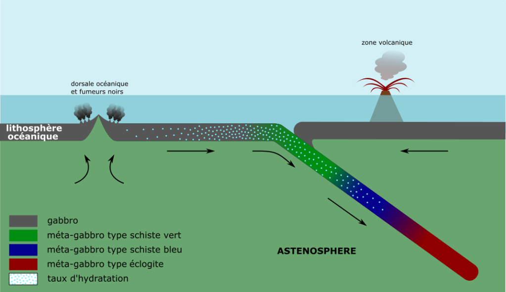 Je suis un Gabbro, roche du plancher océanique, et voici mon histoire. Je me suis formé à très haute température, autour de 1 200°C, il y a un peu moins d’une centaine de millions d’années au milieu de l’océan, au niveau d’une dorsale. Très rapidement les minéraux qui me composent se sont hydratés par le biais des sources hydrothermales : les fumeurs noirs océaniques. Avec l’eau, mes pyroxènes et mes plagioclases ont vu apparaître hornblende, chlorite et actinote. Cette transformation minérale à l’état solide s’appelle le métamorphisme, et cela fait de moi un méta-gabbro. Mais on pourrait aussi m’appeler Schiste vert à cause de la couleur de ces minéraux nouvellement formés.