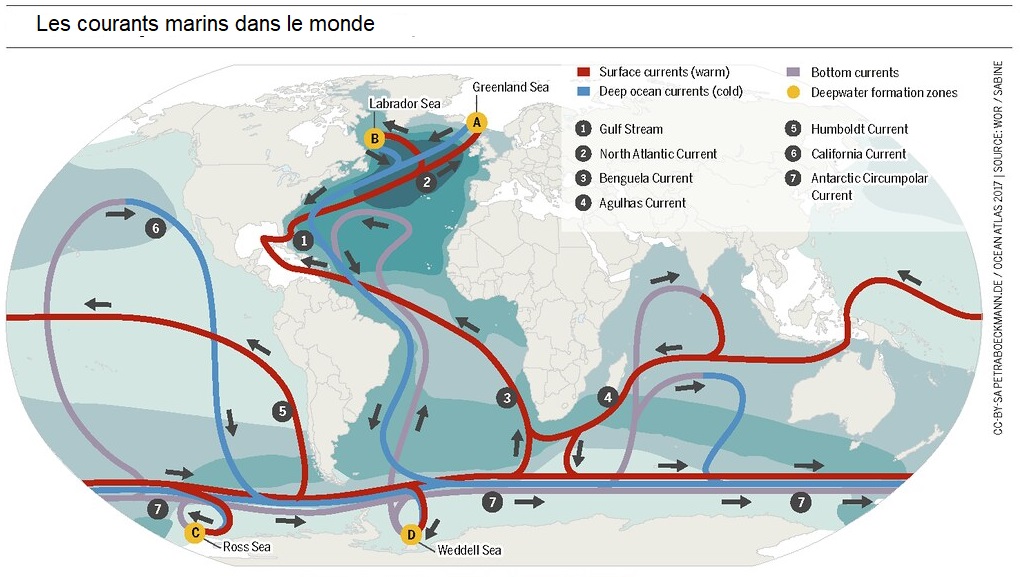 Si ces courants existent, c’est parce que les océans se trouvent sur une planète en révolution possédant une atmosphère. Le mouvement constant de celle-ci est entretenu au niveau de l’équateur par la rotation de la Terre. C’est ce mouvement qui se transmet à la surface de l’océan, contribuant à la création de courants. L’activité géologique de la Terre participe aussi à créer un déplacement d’air et d’eau. En générant de l’énergie sous forme de chaleur, elle initie un mouvement de matière au sein des fluides. Les courants chauds remontent et les courants froids s’engouffrent dans les profondeurs. Ajoutons à cela des différences de salinité de l’eau qui influent sur sa densité, et l’on obtient un schéma grossier de la dynamique océanique telle qu’on la connaît. Le résultat ressemble à un tapis roulant global qui plonge au niveau des pôles.