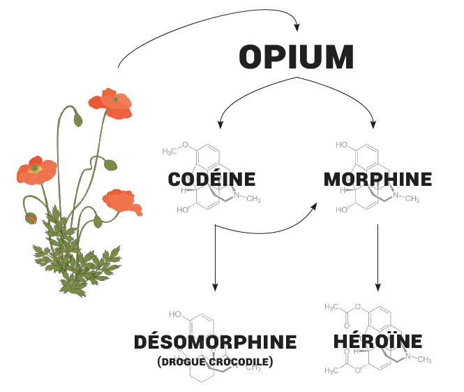 Le Papaver somniferum cache derrière ses pétales délicats un futur fruit défendu extrêmement prolifique. Ce qui passe pour une innocente fleur des champs est à l’origine de toutes les molécules de la famille des opiacés tels que l’opium, la codéine, la morphine, et l’héroïne. Leurs structures sont très proches, autorisant une grande diversité de transformations (cf. schéma), dont beaucoup de dérivés sont utilisés en médecine. Des quatres variétés du pavot somnifère, c’est le pavot blanc qui produit la plus grande quantité d’opium et dont la culture individuelle est naturellement interdite.