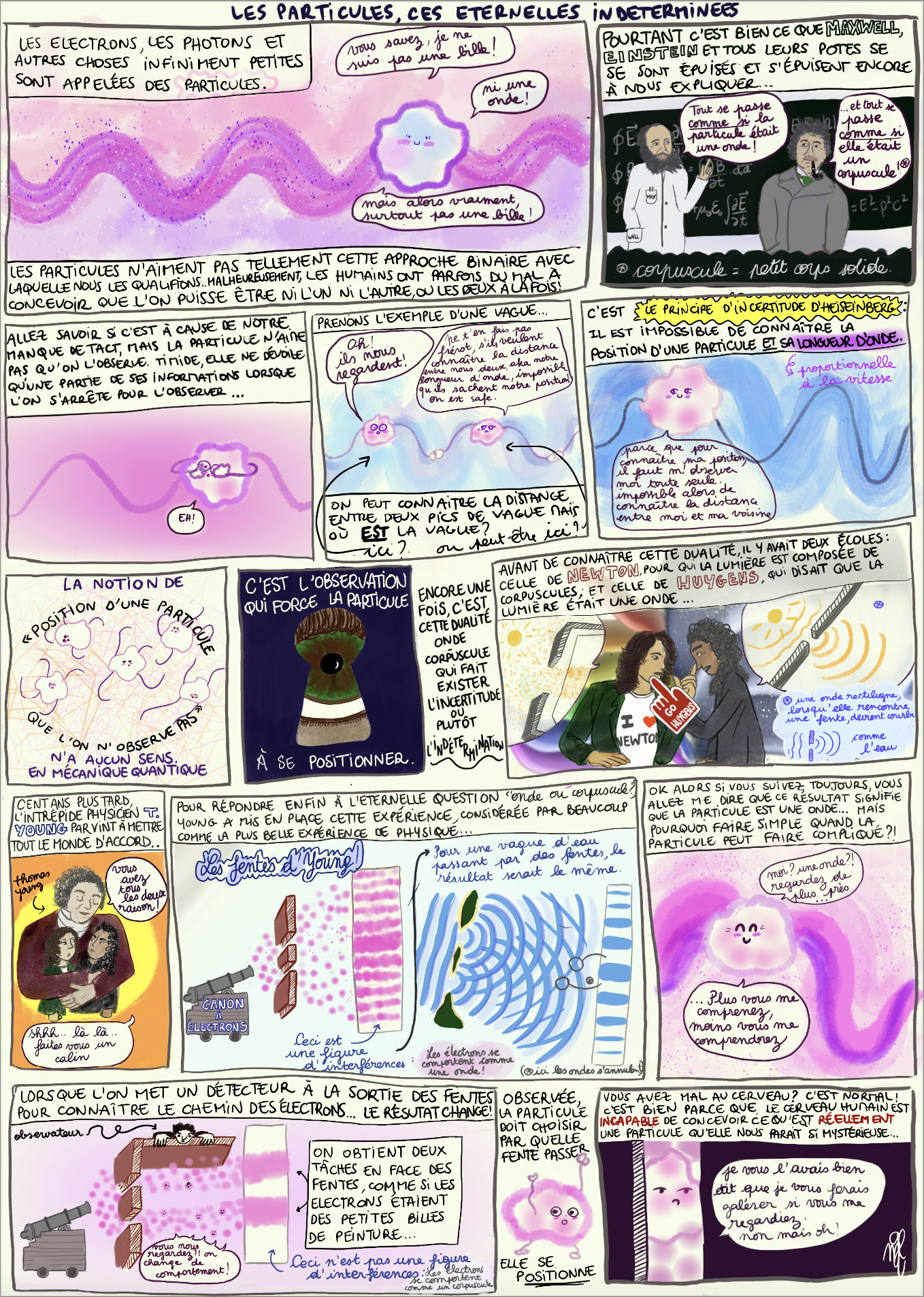 Quoi de plus fondamental que le mouvement des particules ? Dans cette bande dessinée réalisée par Mahaut de Lataillade, notre héroïne est l’une d’entre elles. S’appuyant sur les expériences des plus grands physiciens des derniers siècles, la particule tente de nous expliquer sa complexité : dualité onde-corpuscule, principe d’indétermination, fentes d’Young… Une chose est certaine, la mécanique quantique, ça secoue !